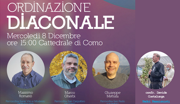 Mercoledì 8 dicembre, alle ore 15.00, in Cattedrale, a Como, il vescovo monsignor Oscar Cantoni presiederà il rito di ordinazione diaconale. Tre uomini saranno consacrati diaconi permanenti (ovvero la loro ordinazione non è finalizzata al sacerdozio); uno sarà diacono (in vista di una successiva ordinazione presbiterale) dei padri della Congregazione della Passione di Gesù Cristo (conosciuti dai più come passionisti che, in diocesi di Como, risiedono a Caravate).